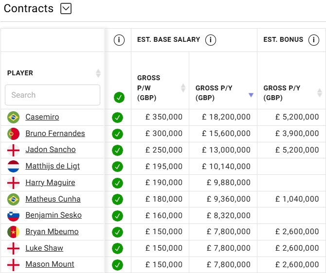 据球员薪资网站capology数据统计,目前桑乔在曼联的基础周薪为25万英镑,约合年薪1300万英镑,同时还有最高520万英镑的奖金。