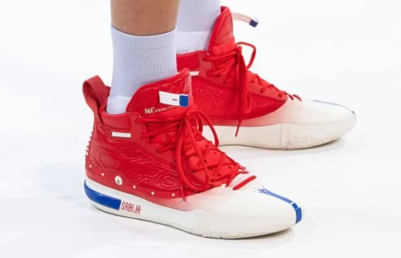 比赛中,约基奇上脚国家队配色361° Joker1 PE。